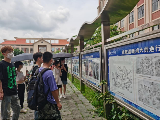 2022年5月27日中午,在11-12号教学楼中间的宣传栏处,学院党员事务管理中心全体成员参观了“助力钦州抗疫、湾大学子先行”美术作品展览,党务中心主任沈鹏同志与全体中心成员参与活动。