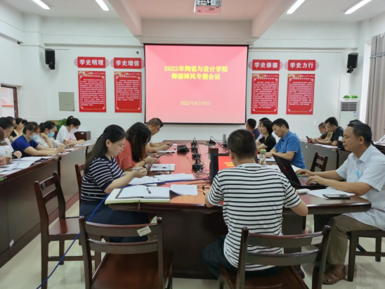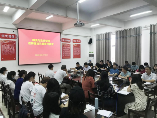 近日,陶瓷与设计学院开展“廉洁从教”师德师风建设系列活动。6月13日, 学院在301会议室召开师德师风专题会议,对全体教师进行廉洁从教宣传教育。学院党委书记古雅峰作专题宣讲,党委副书记、纪委书记何志星作典型案例警示教育。