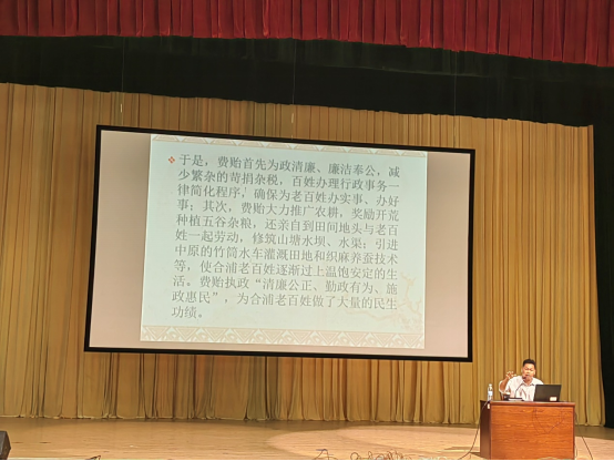 合浦汉代文化博物馆廉世明馆长以《学习习近平总书记考察广西重要讲话精神,传承中华优秀传统文化和廉政文化》为题,结合合浦汉代文化博物馆讲解工作经历,为师生传达学习习近平总书记在合浦汉代文化博物馆、北海铁山港码头、北海金海湾红树林生态保护区视察时的重要讲话精神。他引用习近平总书记重要讲话与师生共勉——“要让历史说话,让文化说话。要加强文物保护和利用,加强历史研究和传承,使中华优秀传统文化不断发扬光大!”勉励师生发挥专业特色,增强文化自信,自觉在传承中华优秀传统文化基础上发展社会主义先进文化,建设社会主义文化强国。