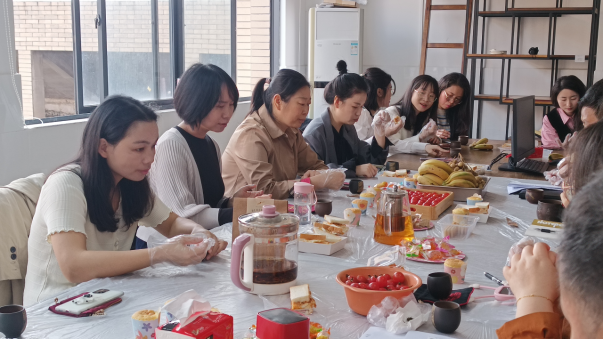 女教师围绕学习党的二十大、建功立业、全民阅读、艺术创作、女性修养、健康幸福等话题进行主题发言。大家一边品茶品尝教师们巧手自制的点心,一边聆听着同事的美好分享,现场气氛轻松融洽。鲁敏老师近期水彩艺术创作主要围绕女性、鲜花、果实等题材进行表现,她说,“女人年轻时如绽放的鲜花,多姿多彩;后来成家立业,结出了幸福温馨的果实,焕发出岁月积淀的美”;谢宇航老师分享坭兴陶艺术创作的感悟,“泥料在自己的手中,经过精心调制、揉搓、塑造、雕刻、煅烧等工序,才有可能成为出彩的艺术品。人生也是如此,需要经过不同阶段的揉搓凝练捶打磨炼,在不断成长中成就自己的理想。”