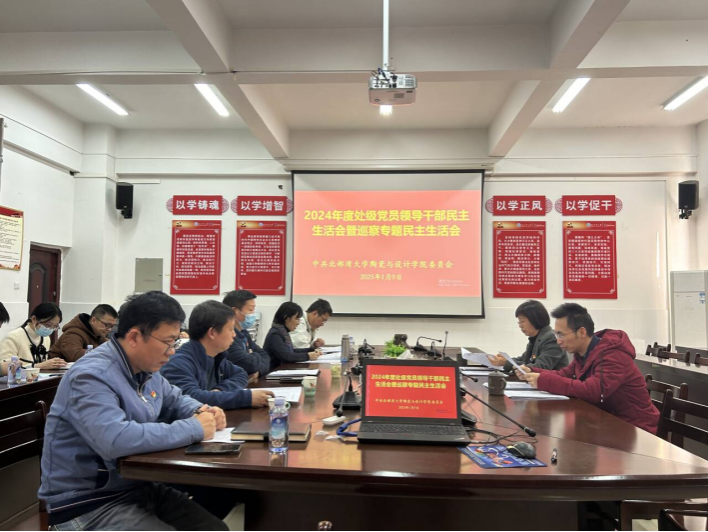 2025年1月9日,陶瓷与设计学院党委在3号楼301会议室召开2024年度处级党员领导干部民主生活会暨巡察专题民主生活会,学院党委书记古雅峰主持。学校督导组——党委常委、副校长陆衡与党委宣传部副部长邓波到会指导。副处级组织员、学院党政办主任、实验室负责人、各支部书记列席会议。