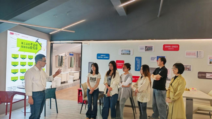 施甘泉总经理向师生介绍了企业文化及建筑室内设计行业现状与市场需求,结合行业标准建设等实践经验,为学生未来职业发展提供指引。他强调,设计从业者需平衡创意与实用、理想与现实、个人成就与社会贡献,树立成熟的职业观与价值观,鼓励学生夯实专业基础、提升综合素养,提高毕业就业能力。师生围绕装饰材料应用、行业发展、用户体验等话题向企业负责人请教,并实地参观装饰工艺与材料展厅。