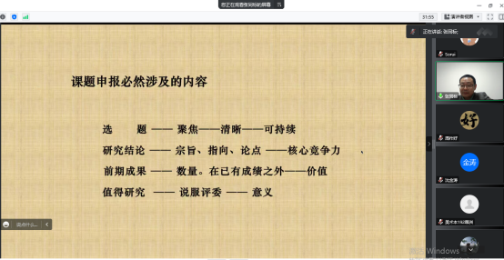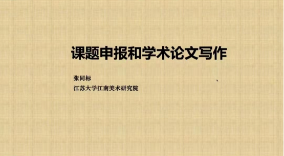 2022年11月10日晚,江苏大学江南美术研究院院长、博士生导师张同标教授应邀为我院众师生带来一场题为“课题申报和学术论文写作”的线上学术报告,报告由我院院长周晓峰教授主持。