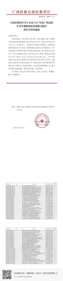 2月28日,广西壮族自治区教育厅下发《关于公布2023年度广西高校中青年教师科研基础能力提升项目立项名单通知》(教桂科研【2023】2号文件),我院有6项课题获批立项。