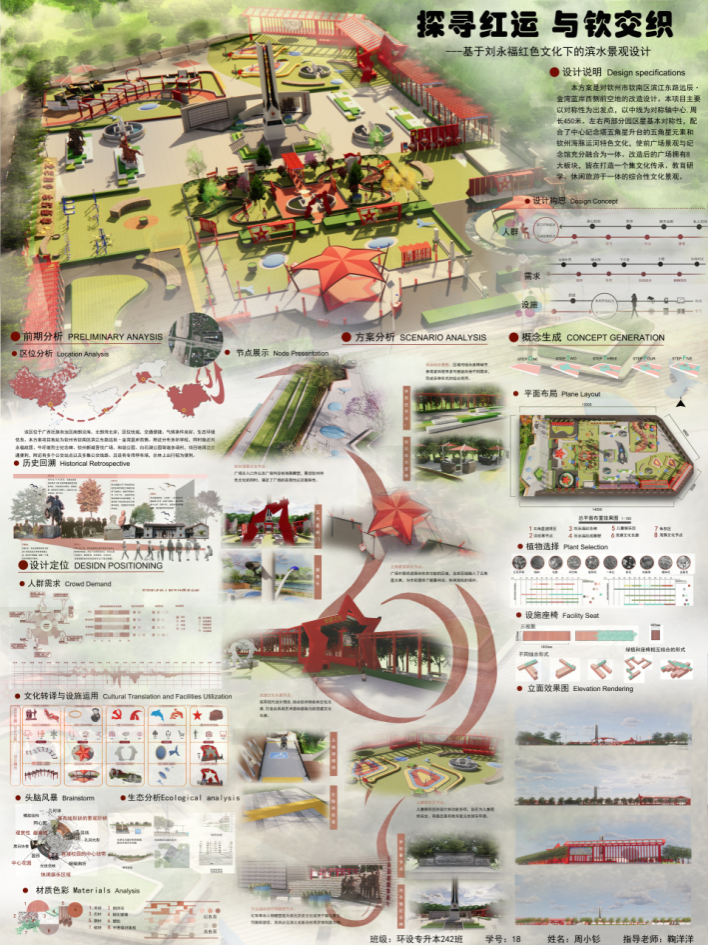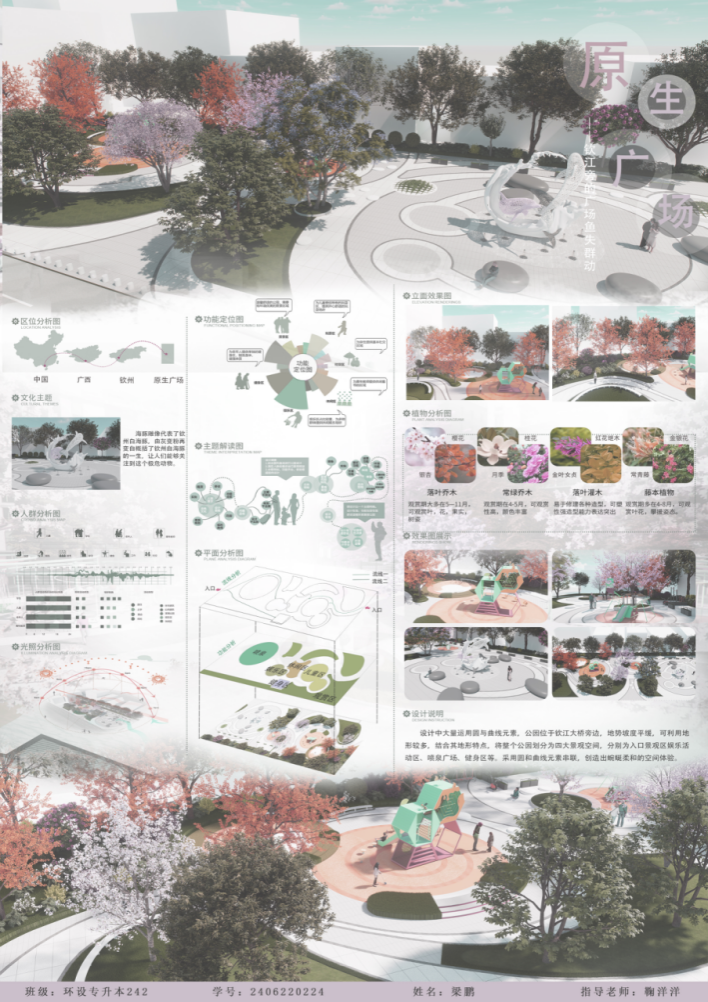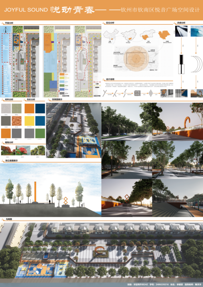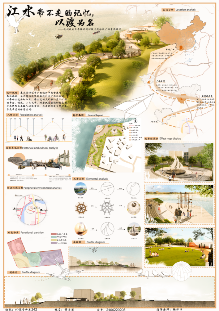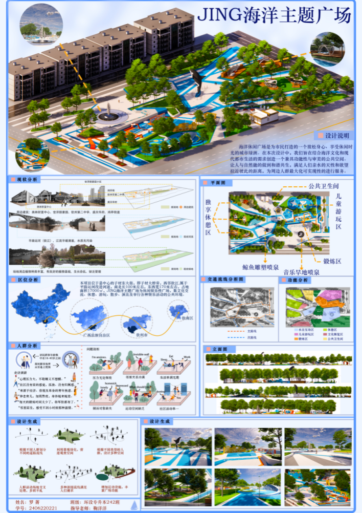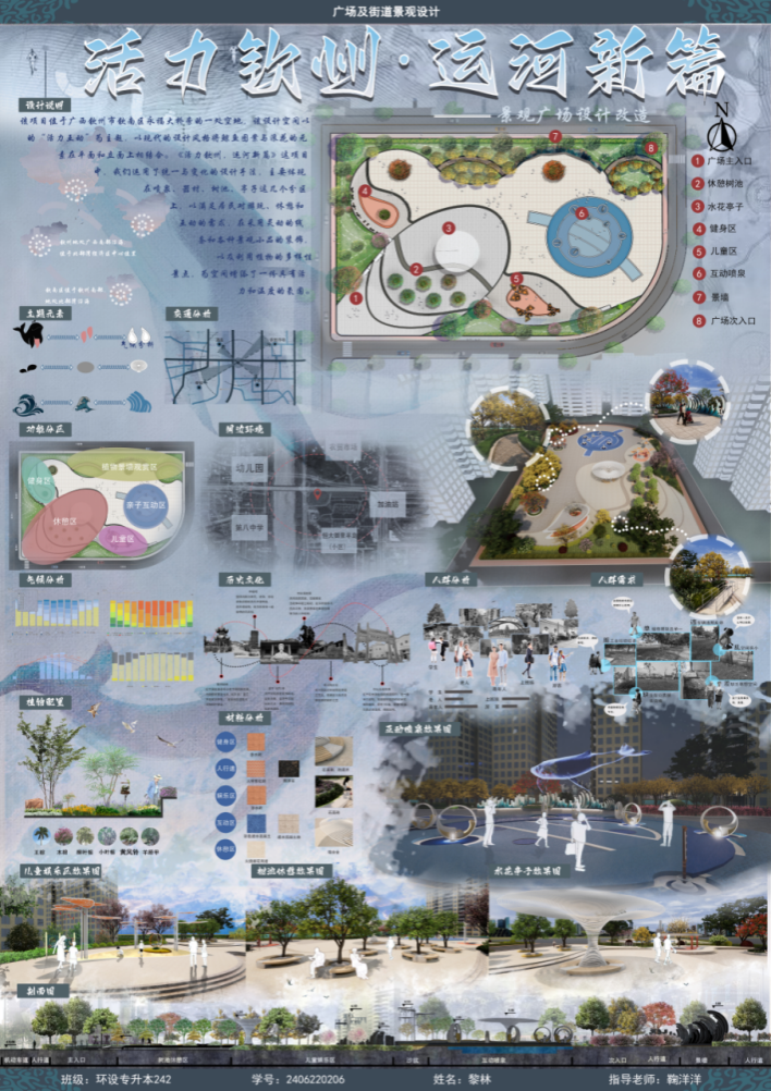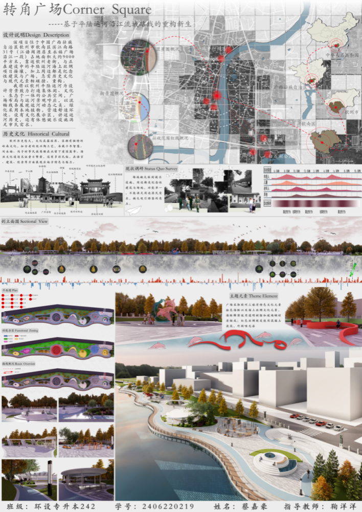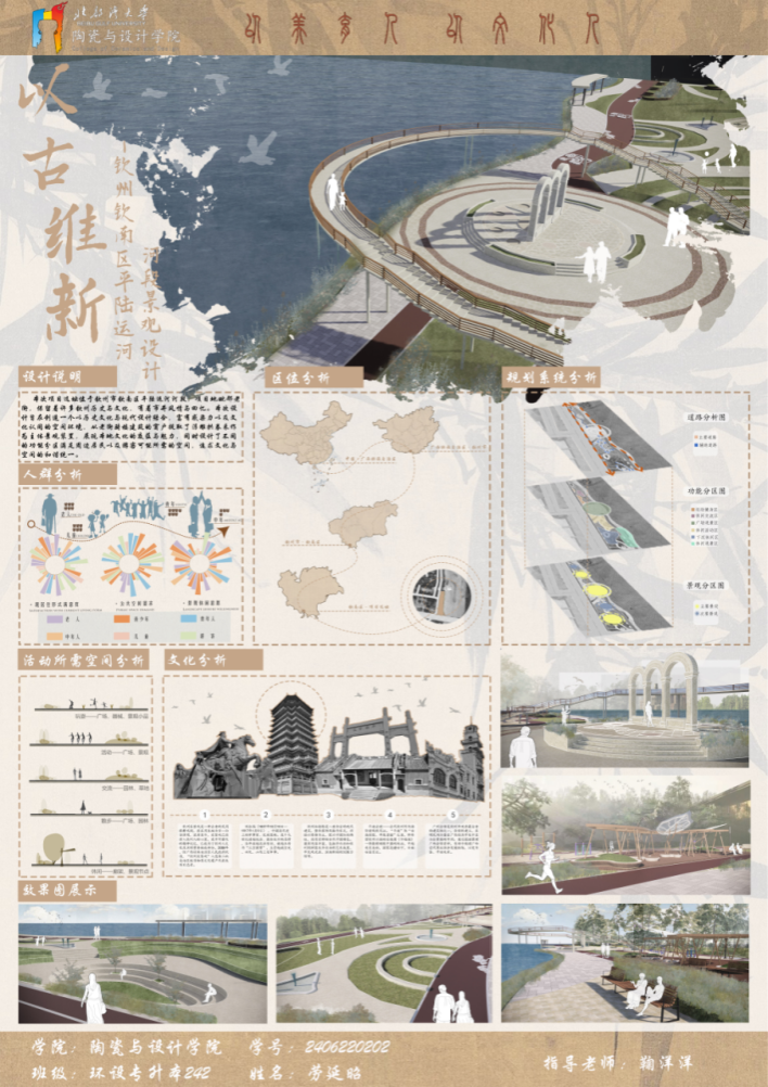 此次展览,旨在激发学生的实践操作与问题解决能力,鼓励学生运用发散性思维,深入挖掘运河文化的丰富内涵,将其作为广场、街道空间设计灵感之源。师生经过反复探讨交流,一系列富有创意的设计作品应运而生,作品巧妙融合滨海运河文化、钦州坭兴陶文化及民族文化,以环保、可持续发展为核心理念,打造兼具地域特色与历史韵味的城市客厅。学生设计巧妙融合传统与现代,让每一处景观都成为传承文化、守护生态的绿色空间。