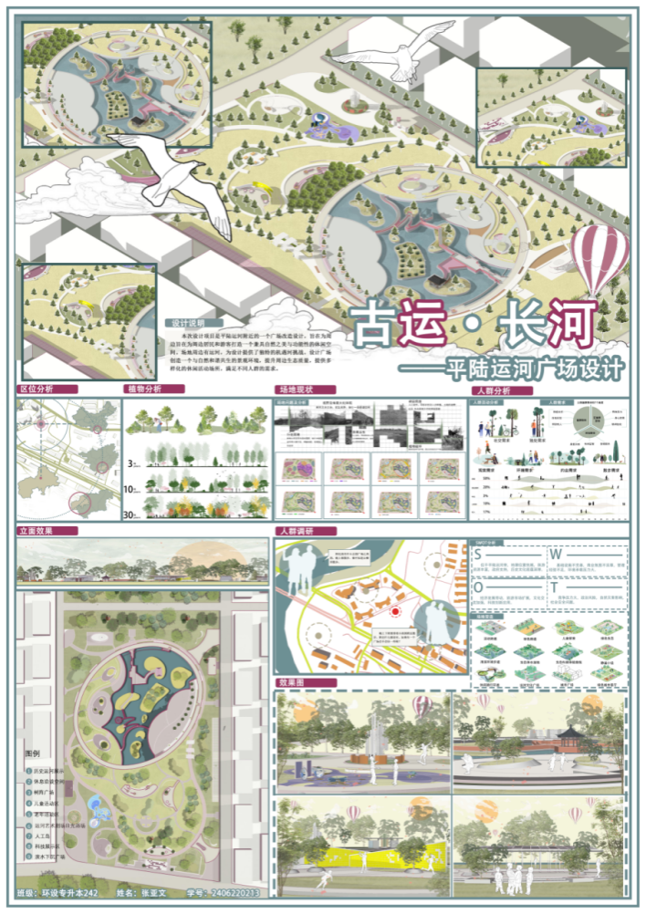 该课程不仅拓宽了同学们的设计视野,还强化了他们运用独特的观察视角与日常生活经验中汲取灵感的能力;结合运河文化的深厚底蕴,设计出各具特色的广场及街道景观改造作品。这些作品不仅是对课程知识的实践应用,更是对未来城市公共空间美好愿景的探索与表达,同时也是对运河文化这一宝贵资源的发展与传承。