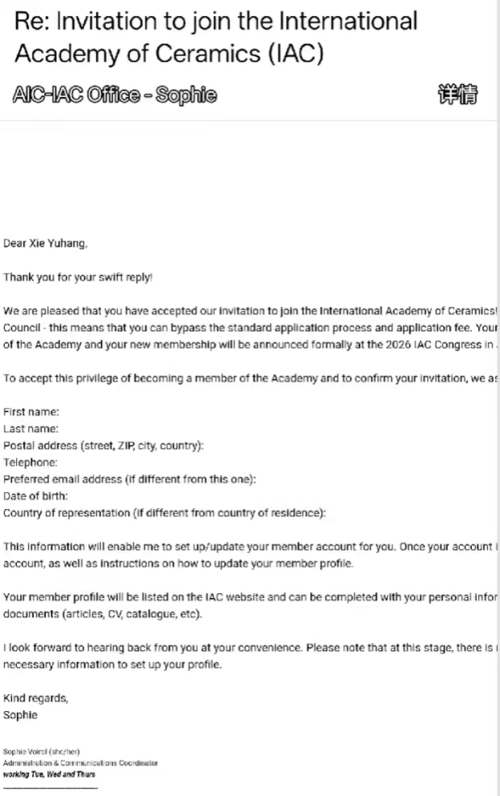 我院青年教师谢宇航老师加入国际陶艺学会的邀请函