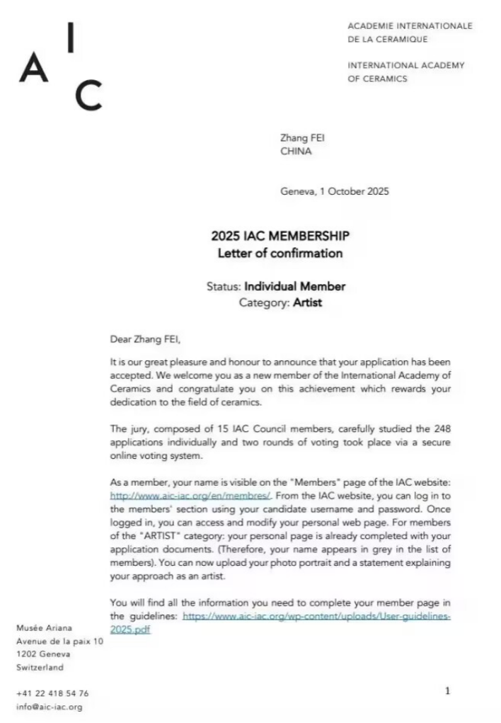 我院青年教师张飞老师加入国际陶艺学会会员的确认信