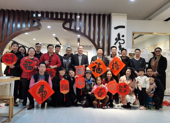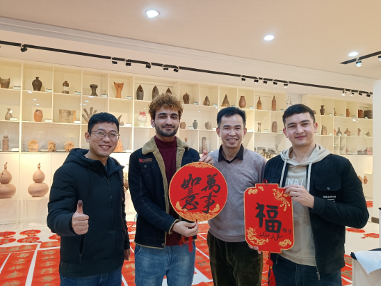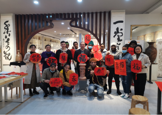 外国留学生也来到现场体验中国年味,志愿者们热情为他们讲述“迎新春、贴春联”的传统习俗和文化内涵,教他们用毛笔书写“福”字,外国留学生跃跃欲试,纷纷在大红纸上写“春”字“福”字,在寓意“团结、平安”的坭兴陶瓶上用各国语言文字表达祝福。