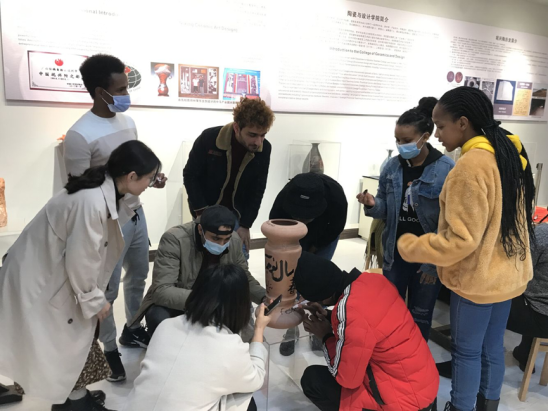 外国留学生在寓意“平安、团结”的坭兴陶瓶上用各国语言文字表达祝福