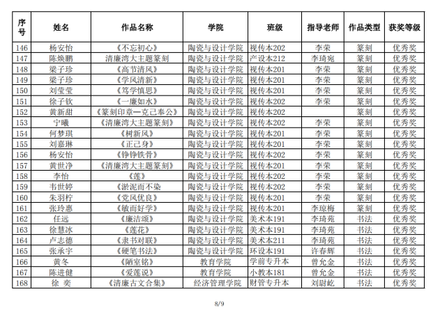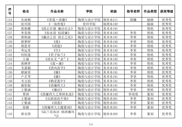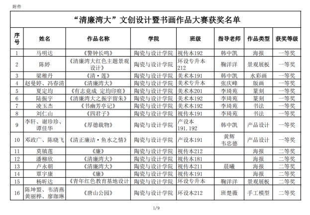 在2022年我校举办“清廉湾大”文创设计暨书画作品大赛中,我院荣获一等奖10名,二等奖16名,三等奖30名,优秀奖105名。