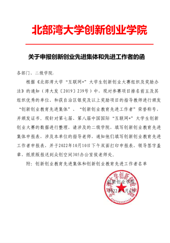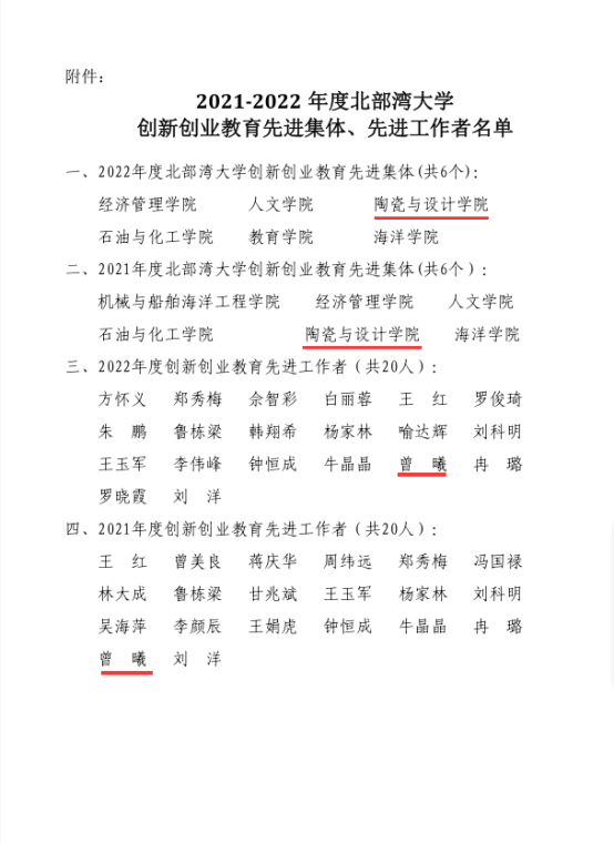 2022年10月,在北部湾大学创新创业学院公布的2021-2022年度北部湾大学创新创业教育先进集体、先进工作者名单中,我院获评“2021年度、2022年度北部湾大学创新创业教育先进集体”,曾老师荣获“2021年度、2022年度创新创业教育先进工作者”。