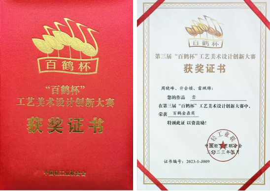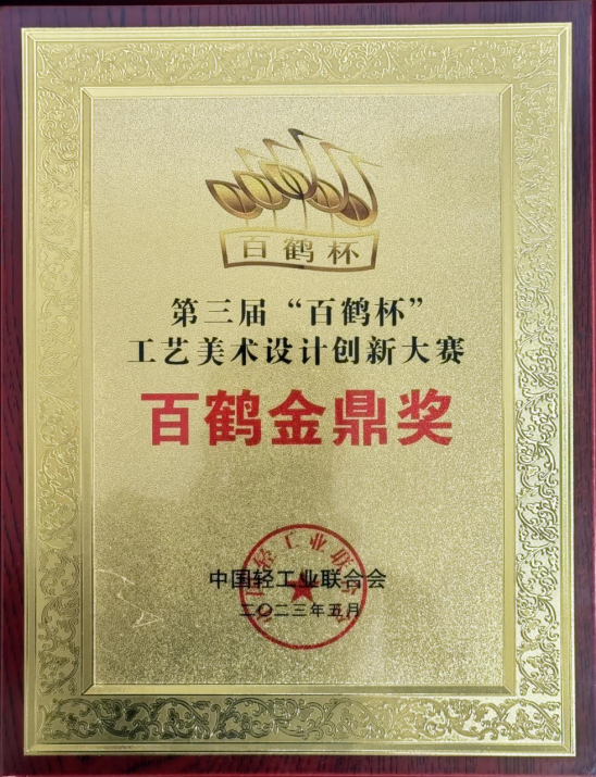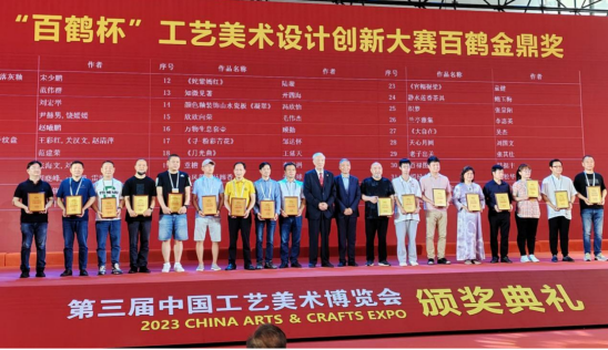 本届博览会设计创新大赛设“百鹤杯”、“百花杯”、“百花奖”三类奖项,其中“百鹤杯”金鼎奖为最高奖项。北部湾大学陶瓷与设计学院教师有11项作品参展参评,其中周晓峰教授的《峦》和《连碧青山》荣获第三届中国工艺美术创新设计大赛最高奖“百鹤杯”金鼎奖和“百花杯”铜奖,梁鸿展的作品《共筑》荣获百鹤新锐奖。据悉,周晓峰获得的“百鹤金鼎奖”是广西区获得的唯一 一项最高奖。