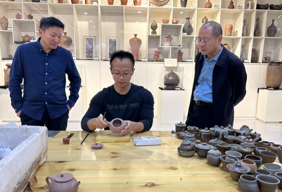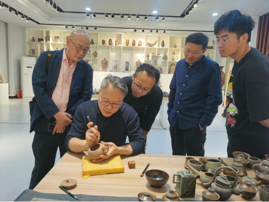 座谈会后,参会专家在坭兴陶展厅进行现场体验活动,探讨坭兴陶与紫砂陶之间工艺方面的区别,并进行了雕刻演示。本次交流活动围绕坭兴陶原材料研究、坭兴陶雕刻技术等进行探讨,对北部湾陶瓷现代产业学院发展与建设具有重要意义。