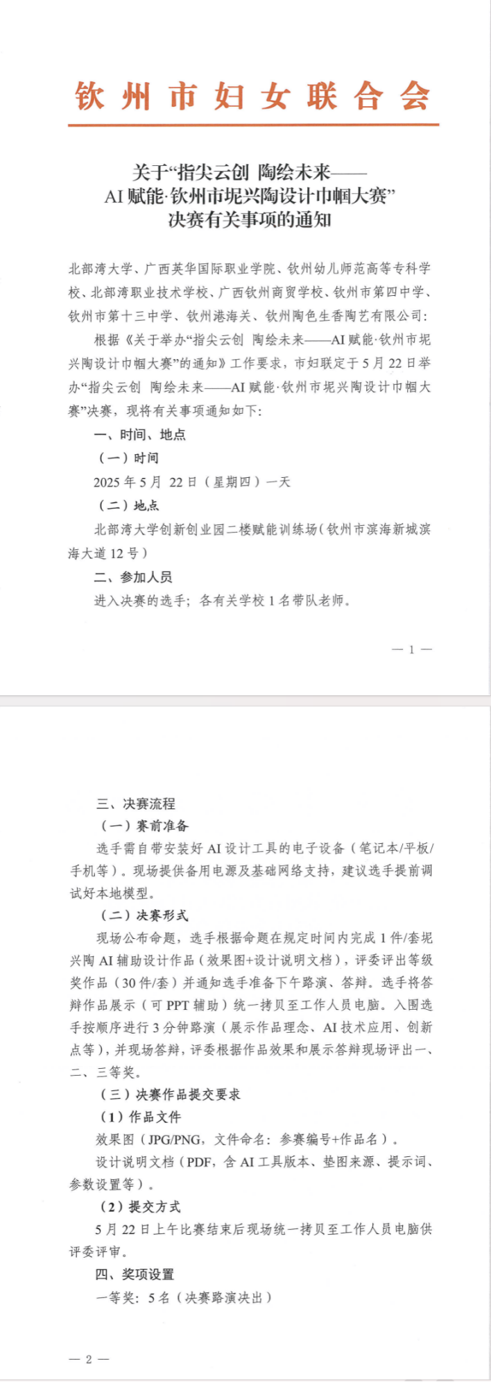 关于举办“指尖云创 陶绘未来——AI赋能·钦州市女性坭兴陶文化创意设计大赛”决赛的通知