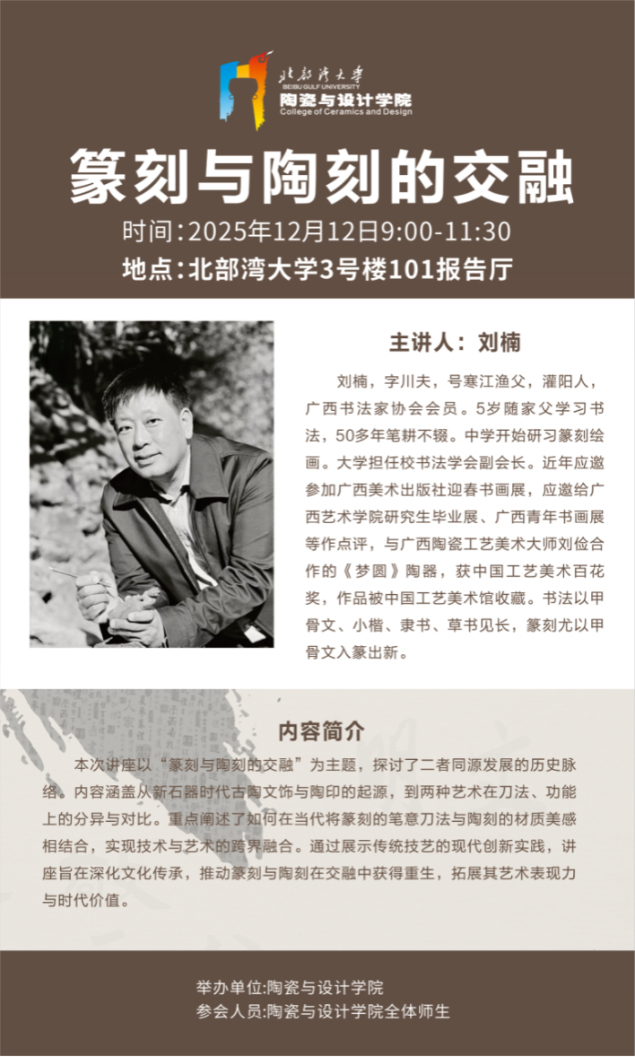 本次讲座以“篆刻与陶刻的交融”为主题,探讨了二者同源发展的历史脉络。内容涵盖从新石器时代古陶文饰与陶印的起源,到两种艺术在刀法、功能上的分异与对比。重点阐述了如何在当代将篆刻的笔意刀法与陶刻的材质美感相结合,实现技术与艺术的跨界融合。通过展示传统技艺的现代创新实践,讲座旨在深化文化传承,推动篆刻与陶刻在交融中获得重生,拓展其艺术表现力与时代价值。