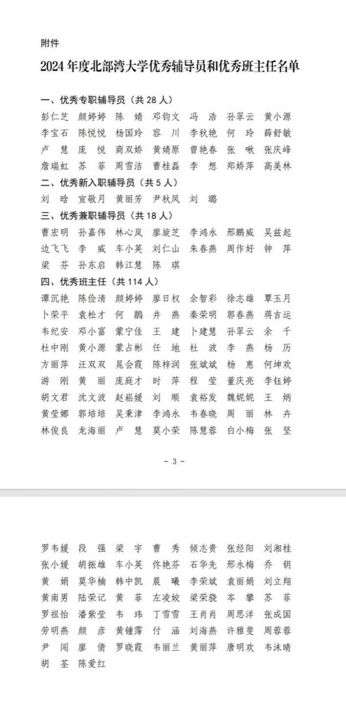 根据北部湾大学文件《关于表彰2024年度北部湾大学优秀辅导员和优秀班主任的决定》(湾大发〔2025〕4号),我院教师荣获2024年度北部湾大学优秀辅导员、优秀班主任、优秀兼职辅导员,名单如下:
