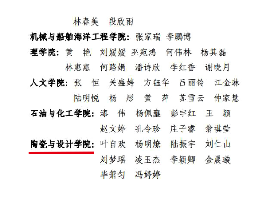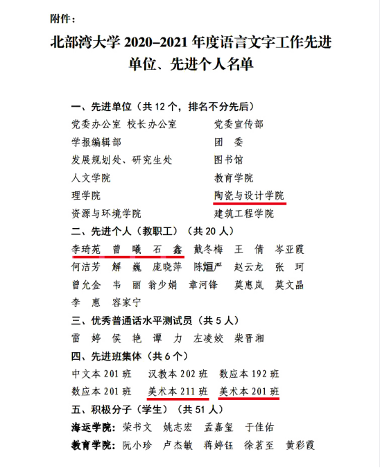 在学校2020-2021年度语言文字工作先进单位和先进个人评选中,我院获得“语言文字工作先进单位”、李琦苑、曾曦、石鑫等3名同志获“语言文字工作先进个人”、美术本211班与美术本201班获“语言文字工作先进班集体”、叶自欢等10名同学获“语言文字工作积极分子”。