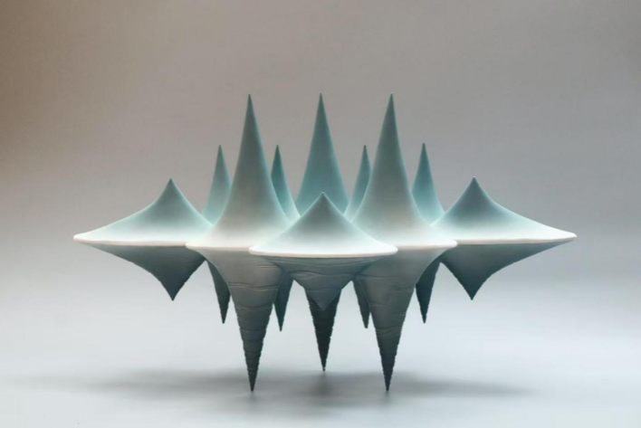 《烟雨漓江》作品灵感来源于广西桂林的漓江山水,作品用对称和刻纹的形式来表达山水倒影和碧波回荡的自然风貌。旨在以陶瓷作品为媒介,传达对祖国壮美山河的赞叹。
