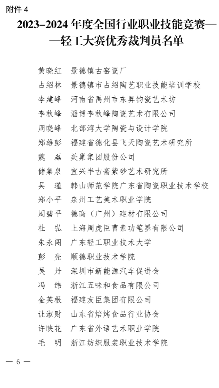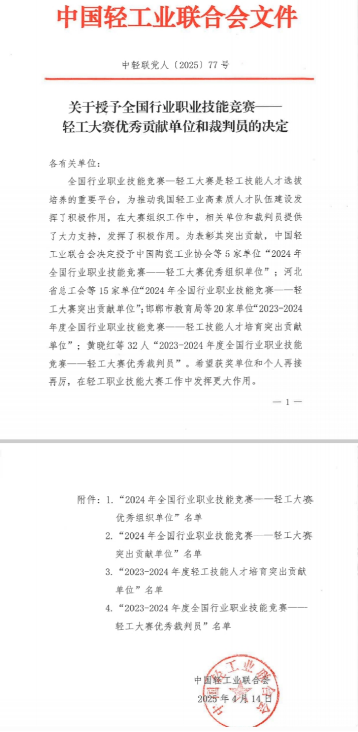 2025年4月24日,由中国轻工业联合会主办的全国行业职业技能竞赛——第六届轻工大赛动员大会在杭州盛大启幕。大会隆重表彰2023-2024年度在大赛工作中作出突出贡献的相关单位和个人,中国轻工业联合会发布《关于授予全国行业职业技能竞赛—轻工大赛优秀贡献单位和裁判员的决定》,北部湾大学陶瓷与设计学院周晓峰院长名列其中,荣获“全国行业职业技能竞赛——轻工大赛优秀裁判员”荣誉称号。周晓峰数次担任自治区级、国家级陶瓷设计师等专业赛项的裁判员和裁判长,执裁严格、评判公正,受到大赛组委会的一致好评。