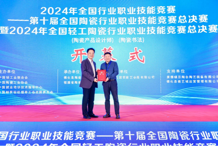 由中国轻工业联合会、中国就业培训技术指导中心、中国陶瓷工业协会、中国财贸轻纺烟草工会全国委员会联合主办,德化县陶瓷发展委员会、福建省陶瓷行业协会承办的2024年全国行业职业技能竞赛——第十届全国陶瓷行业职业技能竞赛(陶瓷产品设计师)总决赛暨2024年全国轻工陶瓷行业职业技能竞赛(陶瓷书法)总决赛于11月20至22日在德化县举行。
