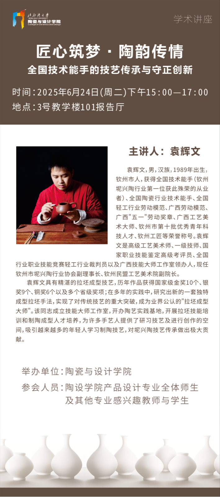 讲座主题:匠心筑梦·陶韵传情——全国技术能手的技艺传承与守正创新