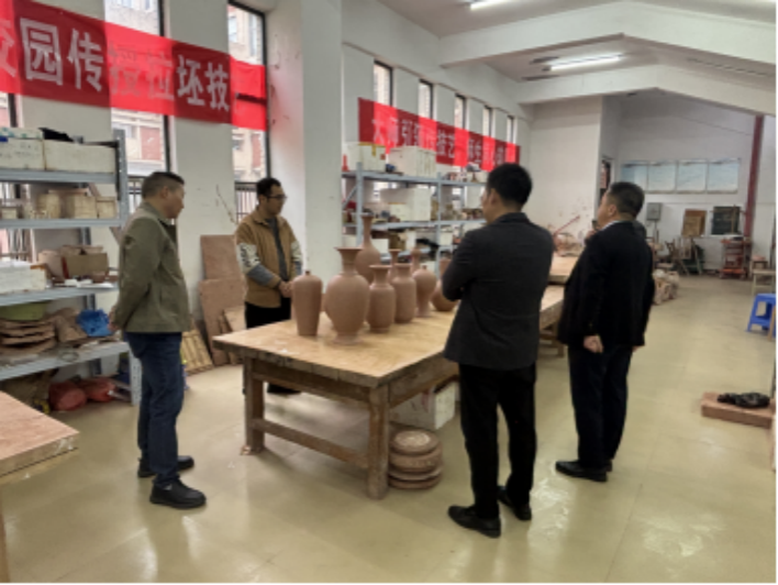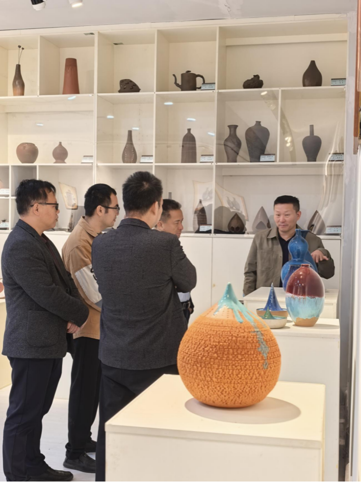 随后,周晓峰院长带领企业团队先后深入坭兴陶展厅、拉坯房、窑炉房、各专业教室及学生实践作品展区,全面展示学院的办学实力、教学成果及育人特色,企业人员对学生扎实的专业技能和新颖的设计能力给予高度肯定。