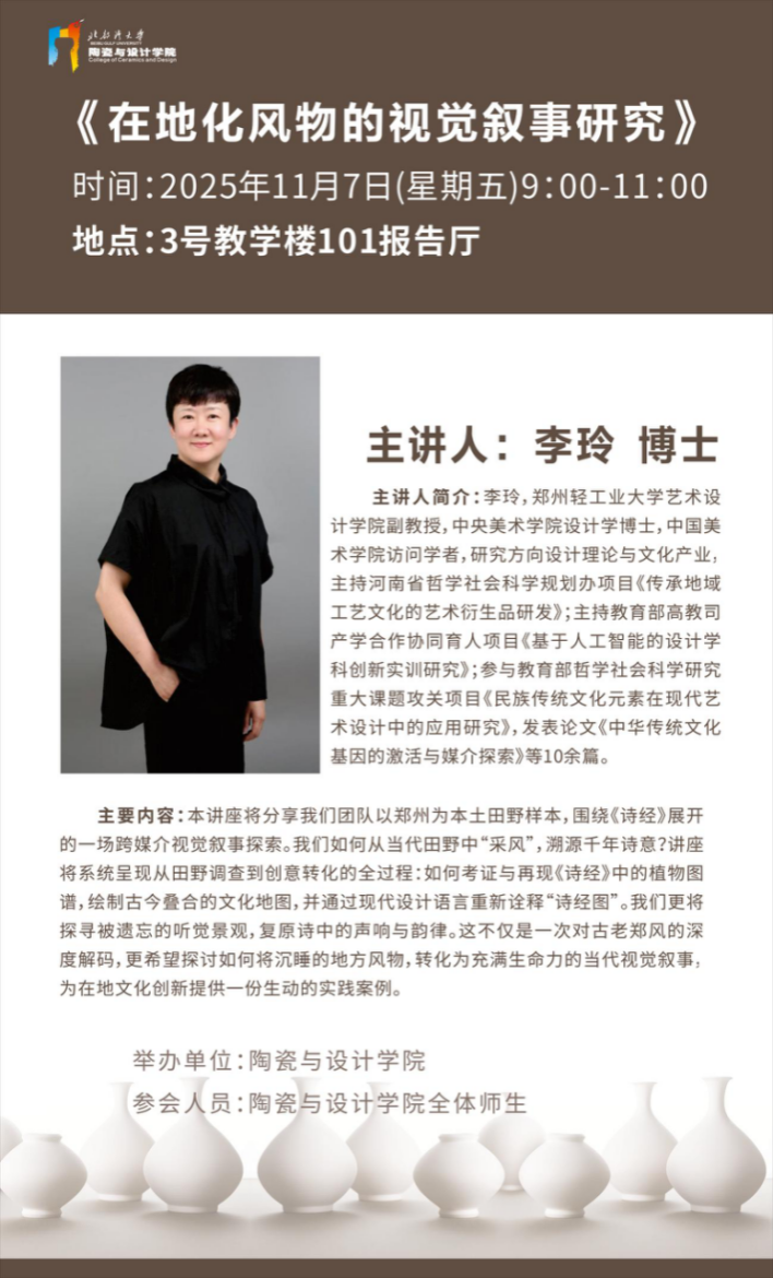 讲座主题一:在地化风物的视觉叙事研究主讲人:李玲(郑州轻工业大学艺术设计学院副教授,中央美术学院设计学博士,中国美术学院访问学者)时间:2025年11月7日9:00-11:00地点:3号教学楼301会议室举办单位:陶瓷与设计学院参会人员:陶瓷与设计学院无课师生及其他感兴趣师生...